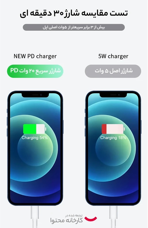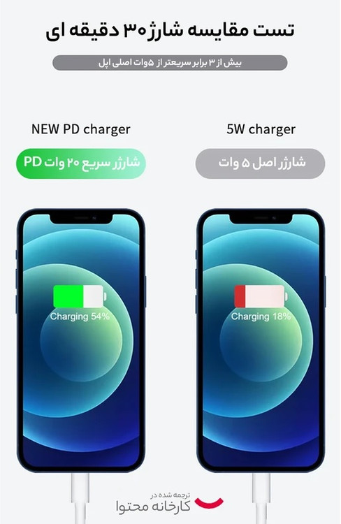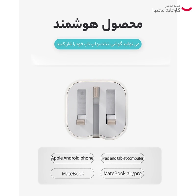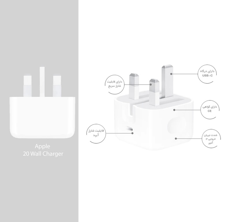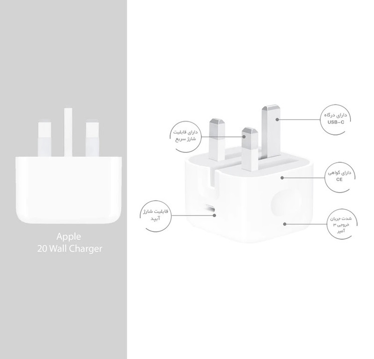 | حداکثر توان خروجی | 20 وات, دارای گواهی CE مناسب برای محصولات اپل iPad ،iPhone، آیپد پرو، آیپد ایر، ایرپاد و سایر دستگاههای دارای رابط USB-C |